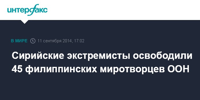 Москва. 11 сентября. INTERFAX.RU - Москва. 11 сентября. INTERFAX.RU - В ООН сообщили об освобождении 45 миротворцев организации с Фиджи, захваченных сирийскими экстремистами на Голанских высотах.