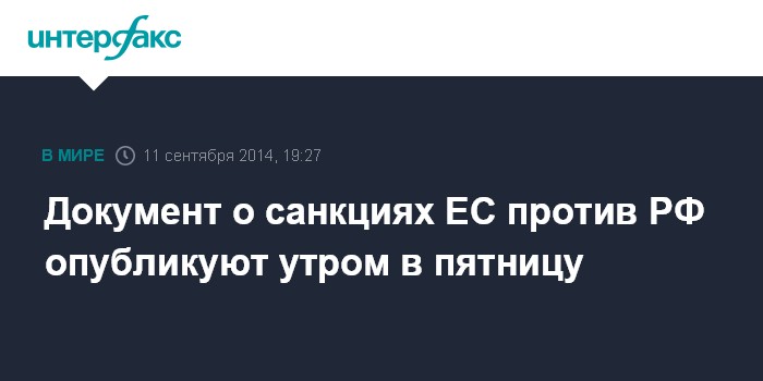 Москва. 11 сентября. INTERFAX.RU - Публикация законодательного акта по пакету новых санкций Евросоюза в отношении России в "Официальном журнале" ЕС планируется утром в пятницу, сообщил "Интерфаксу" дипломатический источник в институтах ЕС.