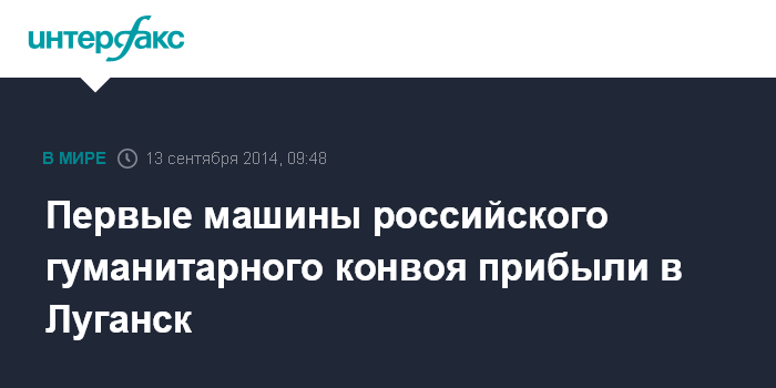 Москва. 13 сентября. INTERFAX.RU - Первые грузовики с российской гуманитарной помощью для востока Украины прибыли на территорию Луганска, передает корреспондент "Интерфакса".