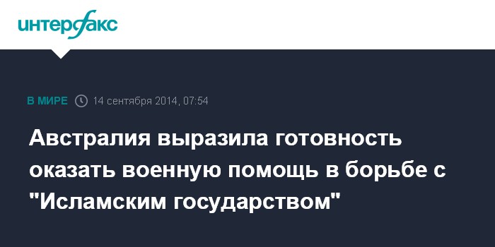 Москва. 14 сентября. INTERFAX.RU - Австралия готова предоставить военные самолеты и контингент своих военнослужащих для участия в военных действиях формируемой международной коалиции для борьбы с террористической группировкой "Исламское государство" (ИГ) в Ираке, если такие действия будут предприниматься, заявил в воскресенье премьер-министр Австралии Тони Эббот.