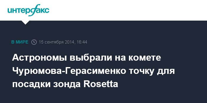 Москва. 15 сентября. INTERFAX.RU - Ученые из Европейского космического агентства (ESA) определились с местом посадки спускаемого модуля космического зонда Rosetta - аппарат сядет на "голову" кометы Чурюмова-Герасименко, сообщается на сайте ESA.