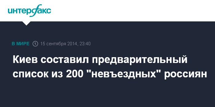 Москва. 15 сентября. INTERFAX.RU - В предварительный список граждан РФ, которым будет запрещен въезд на территорию Украины, внесены около 200 человек. Об этом заявил премьер-министр Украины Арсений Яценюк. Кто войдет в этот перечень - не уточняется.