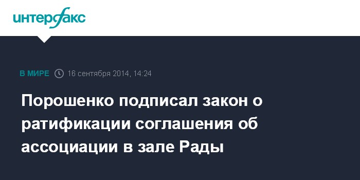 Москва. 16 сентября. INTERFAX.RU - Президент Украины Петр Порошенко подписал закон о ратификации соглашения об ассоциации между Украиной и Евросоюзом в зале заседаний Верховной Рады во вторник.