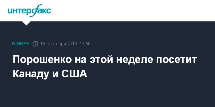 16-17 сентября президент Украины Порошенко будет находиться с визитом в Канаде. Во время визита запланированы переговоры с премьер-министром Канады Стивеном Харпером, встреча с генерал-губернатором Канады Дэвидом Джонстаном, выступление президента Украины на совместном заседании Палаты общин и сената Канады, а также встреча с представителями украинской общины. Также, 17-18 сентября президент Украины будет находиться в США.