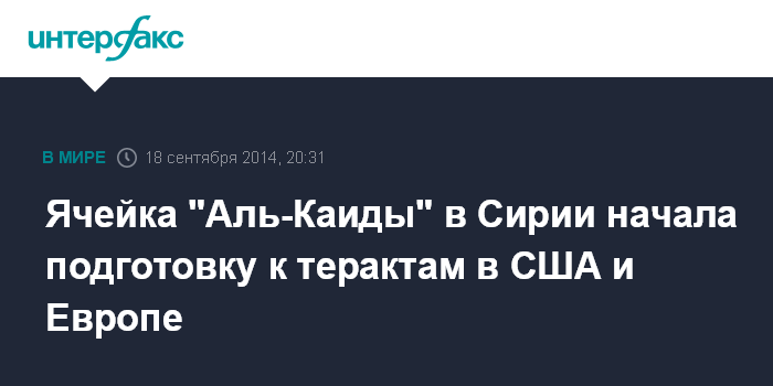 Москва. 18 сентября. INTERFAX.RU - Директор национальной разведки США Джеймс Клэппер сообщил в четверг, что одна из ячеек "Аль-Каиды" в Сирии представляет реальную угрозу национальной безопасности США и готовит террористические атаки, передает агентство Associated Press.