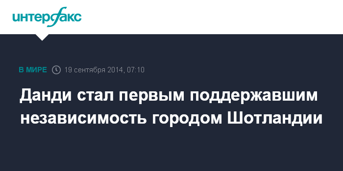 Москва. 19 сентября. INTERFAX.RU - Сторонники отделения Шотландии от Великобритании одержали на референдуме убедительную победу в городе Данди.