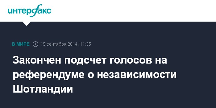 Москва. 19 сентября. INTERFAX.RU - Закончен подсчет голосов на референдуме по вопросу о независимости Шотландии.
