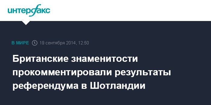 Москва. 19 сентября. INTERFAX.RU - Многие британские знаменитости и политики прокомментировали итоги референдума о независимости Шотландии, по итогам которого регион останется в составе Великобритании.