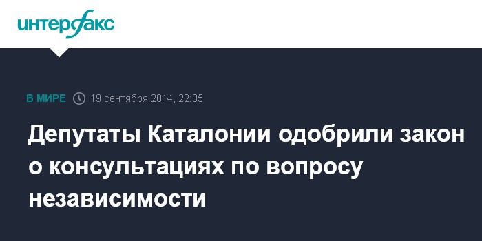 Москва. 19 сентября. INTERFAX.RU - Парламент испанского автономного сообщества Каталония в пятницу принял закон о консультациях, позволяющий проводить опросы без согласия Мадрида. Об этом сообщают западные СМИ.