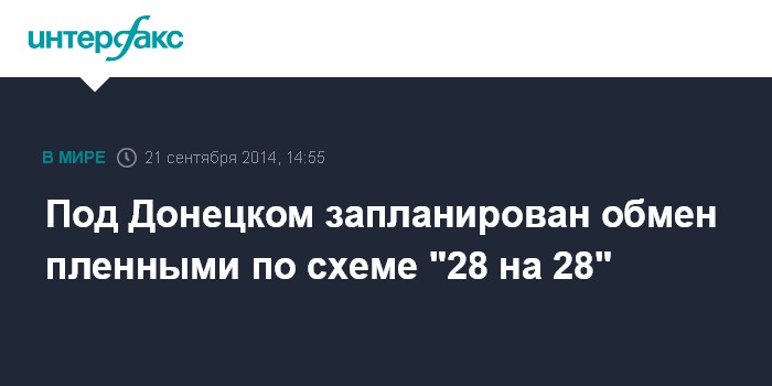 Москва. 21 сентября. INTERFAX.RU - По предварительной информации комитета по военнопленным, сегодня планируется провести очередную процедуру обмена пленными по схеме "28 на 28". Как заявили в комитете, в данный момент украинские военнопленные двигаются в Донецк, после чего из города их повезут на место обмена.