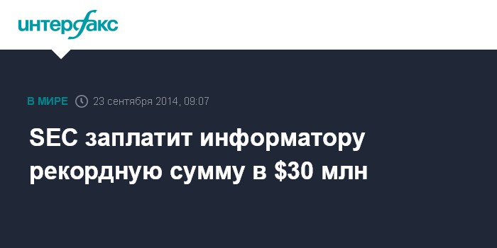 Москва. 23 сентября. INTERFAX.RU - Комиссия по ценным бумагам и биржам (SEC) сообщила в понедельник, что заплатит иностранному информатору, предоставившему "ключевые исходные сведения" о неких мошеннических действиях на финансовом рынке, рекордные $30 млн.