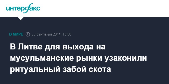Москва. 23 сентября. INTERFAX.RU - Парламент Литвы принял предложение правительства узаконить ритуальный забой скота, который может компенсировать потери от российского продовольственного эмбарго и открыть новые рынки сбыта.