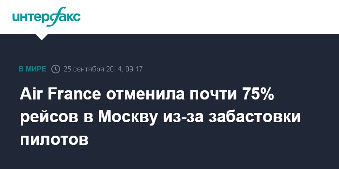 Москва. 25 сентября. INTERFAX.RU - Стартовавшая более недели назад забастовка пилотов французской авиакомпании Air France привела к отмене в четверг почти 3/4 рейсов в Москву, сообщается на сайте авиаперевозчика.
