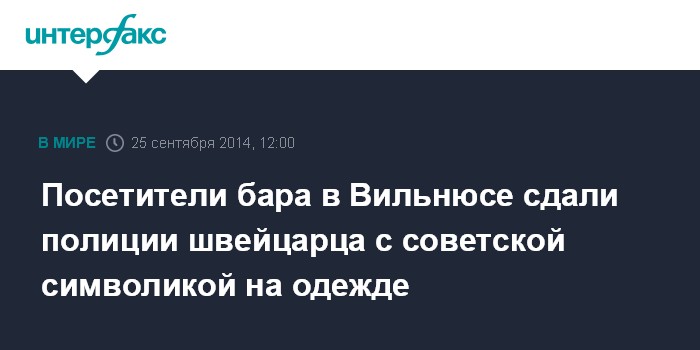 Москва. 25 сентября. INTERFAX.RU - В Вильнюсе вечером в среду был задержан гражданин Швейцарии, на одежде которого была советская символика, сообщил департамент полиции.