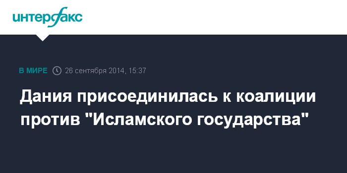Москва. 26 сентября. INTERFAX.RU - Правительство Дании объявило о намерении войти в состав международной коалиции для борьбы с группировкой "Исламское государство" (ИГ) в Ираке, сообщает Associated Press.