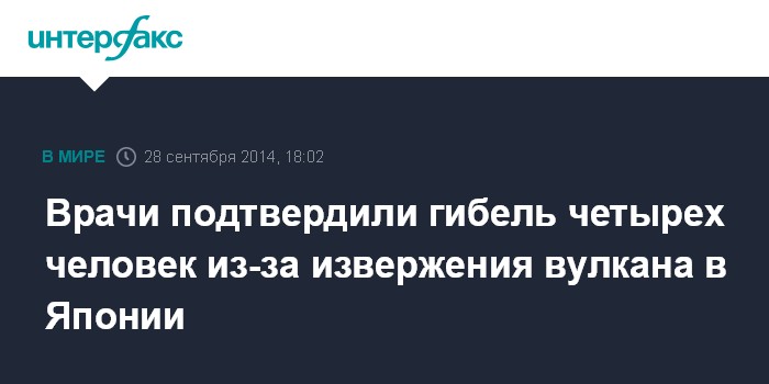 Москва. 28 сентября. INTERFAX.RU - Сотрудники медицинских служб Японии сообщили о гибели четырех человек в результате извержения вулкана Онтакэ в префектуре Нагано, сообщает японская телерадиокомпания NHK.