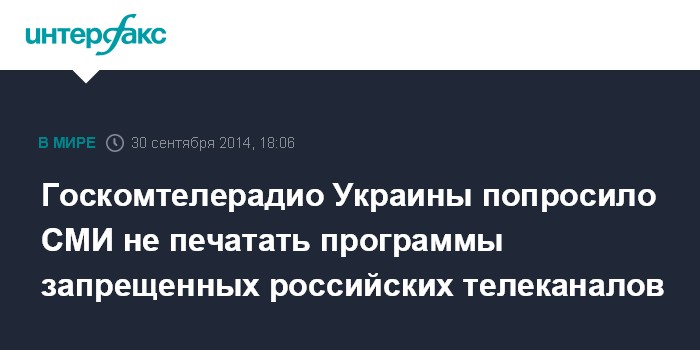 Москва. 30 сентября. INTERFAX.RU - Государственный комитет телевидения и радиовещания Украины обратился к руководителям печатных изданий страны с просьбой не размещать на страницах своих изданий программы российских телеканалов, которые запрещены для ретрансляции в кабельных сетях Украины.