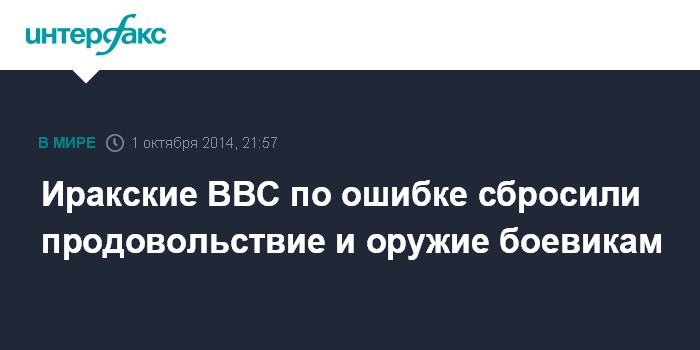 Москва. 1 октября. INTERFAX.RU - Пилоты ВВС Ирака по ошибке сбросили запасы воды, еды, а также оружие боевикам радикальной группировки "Исламское государство", передает межарабский телеканал "Аль-Арабийя" со ссылкой на представителя иракских сил безопасности Хакима аз-Замили.
