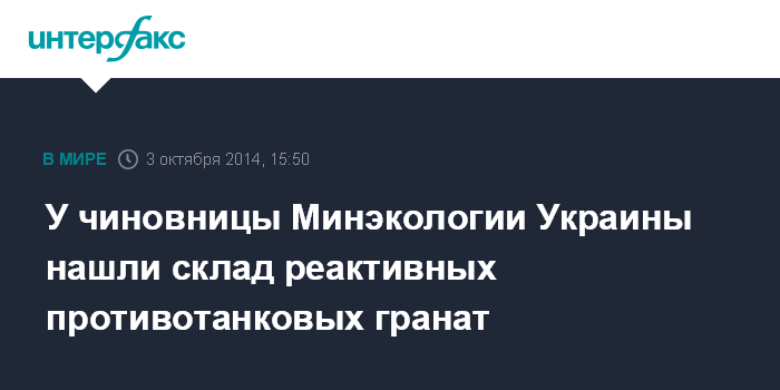 Москва. 3 октября. INTERFAX.RU - Украинские правоохранительные органы задержали начальника управления Министерства экологии и природных ресурсов за получение неправомерной выгоды. При обыске у нее нашли восемь реактивных противотанковых гранат РПГ-26, сообщил советник министра внутренних дел Украины Зорян Шкиряк.