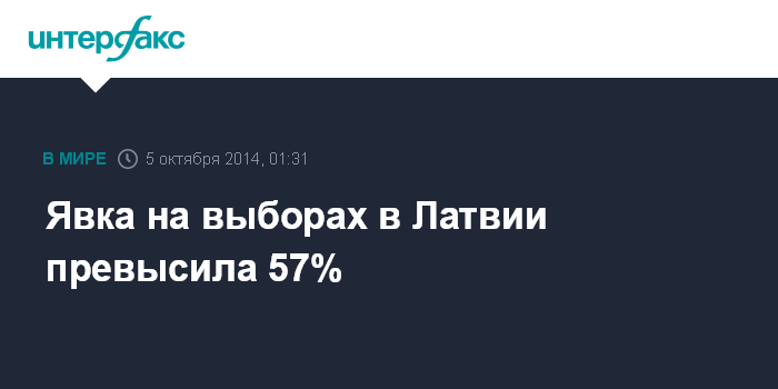 Москва. 5 октября. INTERFAX.RU - Согласно обобщенным данным Центральной избирательной комиссии (ЦИК), на выборах сейма Латвии 12-го созыва проголосовали 57,3% (888,9 тыс.) избирателей. Об этом латвийскому ТВ сообщил председатель ЦИК Арнис Цимдарс, комментируя предварительные результаты состоявшегося в субботу голосования.