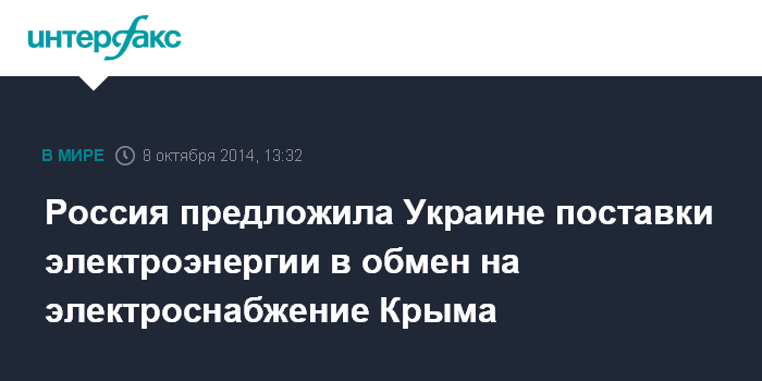 Москва. 8 октября. INTERFAX.RU - Россия предложила Украине поставлять электроэнергию, и одним из условий поставок является отмена ограничений электроснабжения Крыма, сообщил министр топлива и энергетики республики Крым Сергей Егоров.