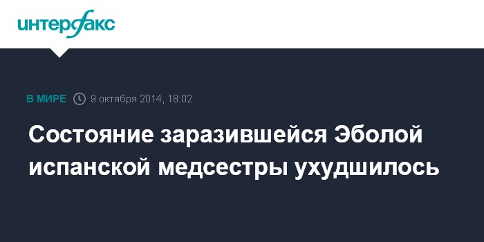 Москва. 9 октября. INTERFAX.RU - Состояние медсестры Тересы Ромеро, ставшей первым человеком, заразившимся вирусом Эбола на территории ЕС, за последнее время ухудшилось, сообщает в четверг BBC со ссылкой на заявление больницы в Мадриде, где находится Ромеро. В настоящий момент она испытывает проблемы с дыханием.