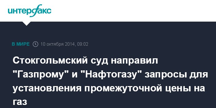 Премьер-министр Украины Арсений Яценюк 6 октября заявил, что временную цену российского газа для Украины в случае провала трехсторонних газовых переговоров определит Стокгольмский арбитраж. По словам премьера, такое решение суда, по сути, является обеспечительной мерой, и в ее принятии заинтересована Европа. В то же время он не уточнил, с какого времени начинается отчет месячного срока, в течение которого суд определит временную цену.
