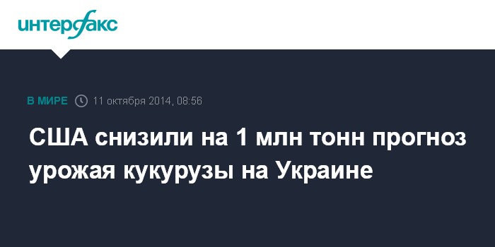 Москва. 11 октября. INTERFAX.RU - Министерство сельского хозяйства США (USDA) снизило прогноз урожая кукурузы на Украине в 2014/2015 маркетинговом году (МГ, сентябрь-август) на 1 млн тонн, до 25 млн тонн.