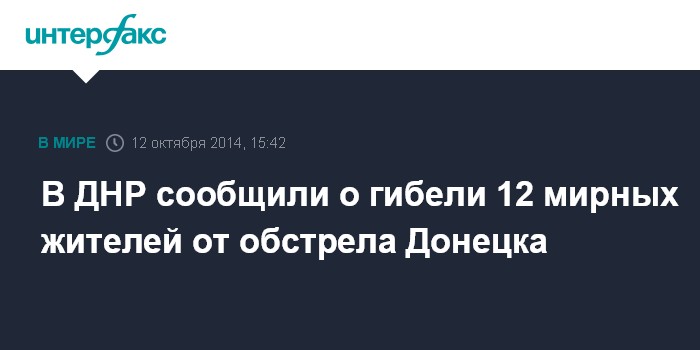 Москва. 12 октября. INTERFAX.RU - От обстрела за минувшие сутки украинскими силовиками жилых кварталов Донецка погибло 12 мирных жителей, сообщил в воскресенье журналистам представитель политотдела минобороны самопровозглашенной "Донецкой народной республики" (ДНР). "За прошедшие сутки погибло 12 человек, в том числе 6 женщин и один ребенок", - сказал он.
