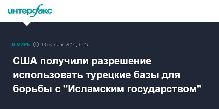 Москва. 13 октября. INTERFAX.RU - Турецкие власти дали США "зеленый свет" на использование расположенных на своей территории военных баз для борьбы с боевиками группировки "Исламское государство" (ИГ), сообщила советник президента США по национальной безопасности Сьюзан Райс.