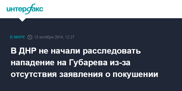 Москва. 13 октября. INTERFAX.RU - Правоохранительные органы ДНР пока не получали заявлений от близких или доверенных лиц бывшего "народного губернатора" Донбасса Павла Губарева с требованием провести расследование покушения на него.