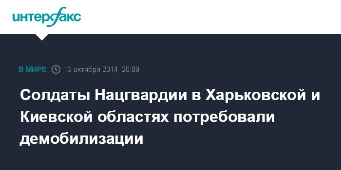 Москва. 13 октября. INTERFAX.RU - Солдаты Нацгвардии Украины срочной службы из Киевской и Харьковской областей провели акции с требованием демобилизации.
