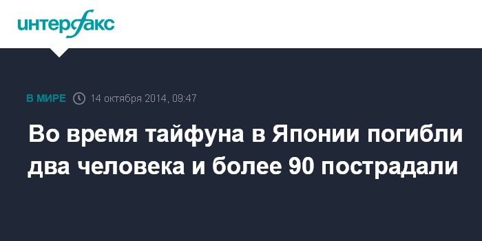 Москва. 14 октября. INTERFAX.RU - Два человека погибли и более 90 получили ранения в результате удара тайфуна "Вонгфонг" по территории Японии, сообщает японский телеканал NHK.