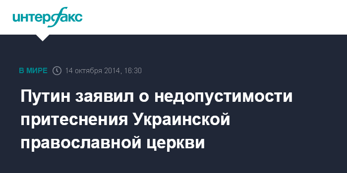 Москва. 14 октября. INTERFAX.RU - Президент РФ Владимир Путин выразил возмущение тем, что правозащитники на Украине не обращают внимания на ситуацию с притеснением в стране Украинской православной церкви Московского патриархата.