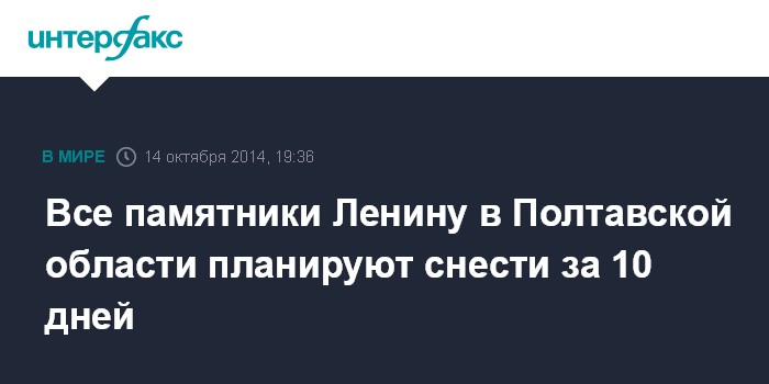 Москва. 14 октября. INTERFAX.RU - В Полтавской области Украины к годовщине Голодомора, 24 ноября, планируют демонтировать все памятники Ленину. Соответствующее распоряжение подписал глава ОГА Виктор Бугайчук, сообщили в пресс-службе облгосадминистрации.