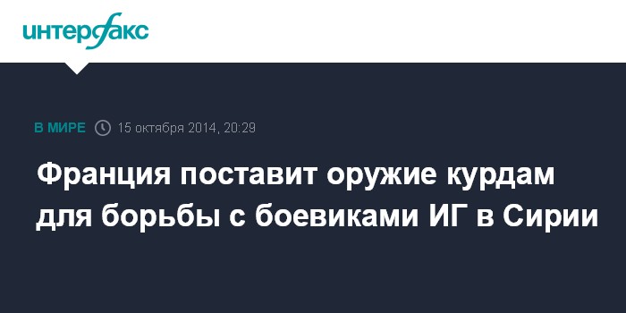 Москва. 15 октября. INTERFAX.RU - Власти Франции поставят вооружение бойцам курдского ополчения, сражающимся против боевиков из радикальной группировки "Исламское государство" (ИГ) на севере Сирии, сообщает в среду агентство Associated Press.