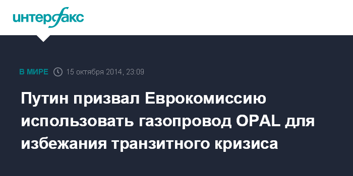 Москва. 15 октября. INTERFAX.RU - Президент России Владимир Путин призвал Еврокомиссию разрешить использование газопровода OPAL на полную мощность, поскольку в настоящий момент сохраняется проблема транзита газа в Европу через украинскую территорию.