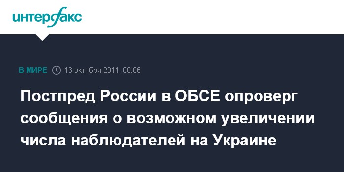 Москва. 16 октября. INTERFAX.RU - Предложений об увеличении миссии ОБСЕ на Украине до 1500 человек, как это предлагает президент страны Петр Порошенко, пока не поступало, заявил постпред РФ при ОБСЕ Андрей Келин.