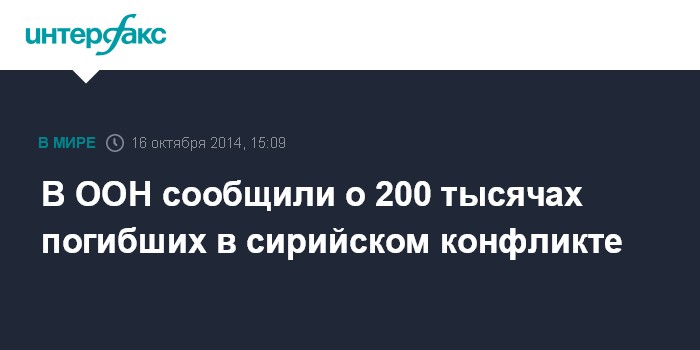 Москва. 16 октября. INTERFAX.RU - Верховный комиссар ООН по правам человека Зейд Раад аль-Хусейн заявил в четверг, что число жертв конфликта в Сирии превысило 200 тыс. человек, передает агентство EFE.