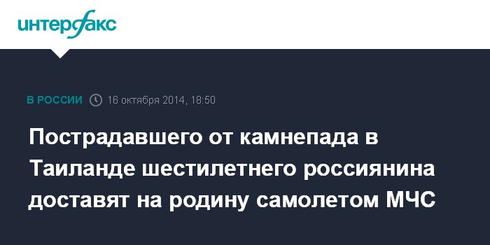 Москва. 16 октября. INTERFAX.RU - МЧС России направляет самолет в Таиланд за шестилетним мальчиком Александром Бакиевым, пострадавшим во время камнепада, сообщил "Интерфаксу" в четверг официальный представитель ведомства Александр Дробышевский.