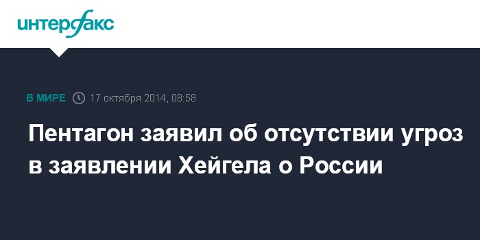 Москва. 17 октября. INTERFAX.RU - З Недавние комментарии министра обороны США Чака Хейгела в отношении России не содержали каких-либо угроз этой стране, заявил в четверг на пресс-конференции пресс-секретарь Пентагона контр-адмирал Джон Кирби.