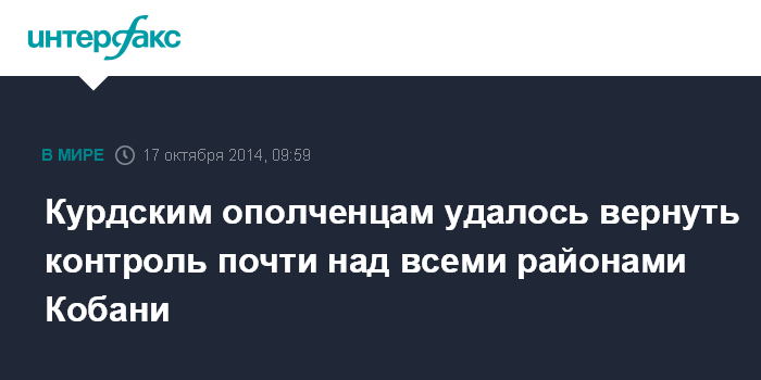 Москва. 17 октября. INTERFAX.RU - Действующие в сирийском городе Кобани курдские ополченцы утверждают, что смогли почти полностью очистить его от боевиков "Исламского государства", передает в пятницу BBC.