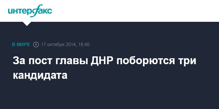 Москва. 17 октября. INTERFAX.RU - Три кандидата поборются за должность главы ДНР, заявил журналистам глава ЦИК самопровозглашенной республики Роман Лягин. На должность претендуют действующий премьер-министр ДНР Александр Захарченко, Юрий Сивоконенко и Александр Кофман.