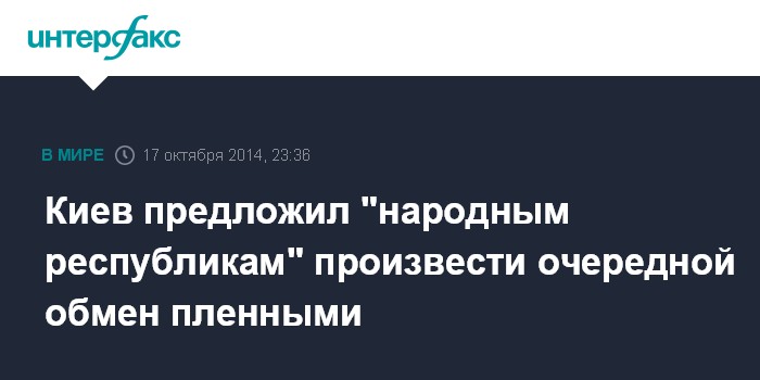 Москва. 17 октября. INTERFAX.RU - Украинская сторона готова обменять около 400 ополченцев на своих военных. Об этом сообщил советник главы СБУ Маркиян Лубкивский в эфире ТРК "Украина".