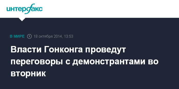 Москва. 18 октября. INTERFAX.RU - Руководство Гонконга намерено во вторник провести переговоры с демонстрантами, выступающими с требованием реорганизации системы выборов руководства этого специального административного района (САР) КНР, сообщила в субботу генеральный секретарь гонконгской администрации Кэрри Лам. "В настоящий момент мы рассчитываем, что они (переговоры - ИФ) состоятся во вторник, 21 октября, во второй половине дня", - сказала она журналистам.