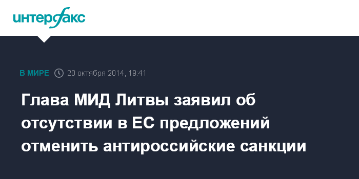 Москва. 20 октября. INTERFAX.RU - На встрече министров иностранных дел стран-членов Евросоюза в понедельник никто не предлагал смягчить санкции в отношении России, заявляет глава МИД Литвы Линас Линкявичюс.