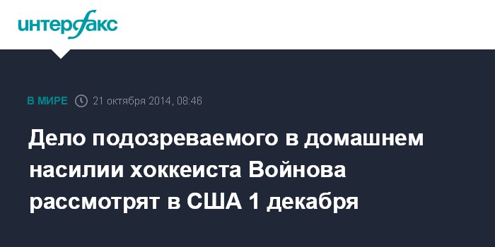 Москва. 21 октября. INTERFAX.RU - Судебное заседание по делу 24-летнего российского хоккеиста "Лос-Анджелес Кингз" Вячеслава Войнова, который был задержан в понедельник по подозрению в домашнем насилии, а затем освобожден под залог в $50 тыс., назначено на 1 декабря, сообщил адвокат Крейг Ренецки, представляющий интересы В.Войнова.