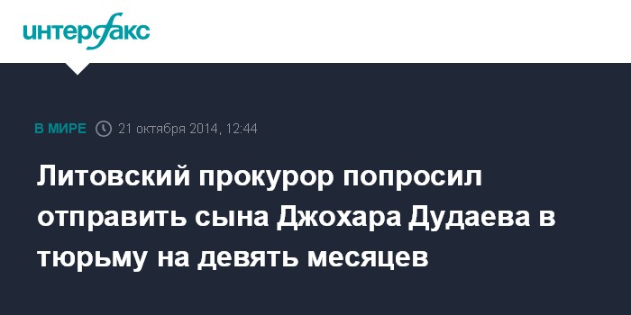 Москва. 21 октября. INTERFAX.RU - Литовский прокурор просит наказать девятью месяцами лишения свободы с отсрочкой наказания на один год сына бывшего президента Чечни Деги Дудаева, обвиняемого в подделке литовских паспортов.