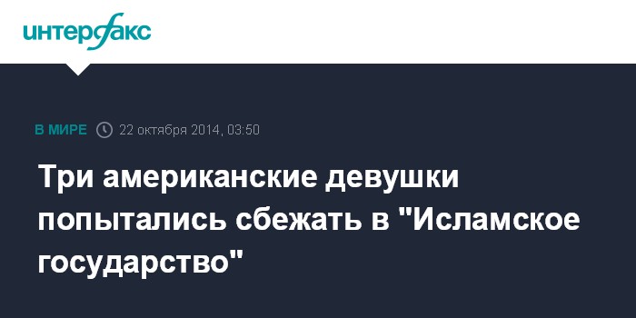 Москва. 22 октября. INTERFAX.RU - Три девушки-гражданки США, сбежавшие из Денвера, направлялись в Турцию, чтобы попасть на территорию, подконтрольную группировке "Исламское государство", сообщил телеканал CNN в среду со ссылкой на источник в ФБР.