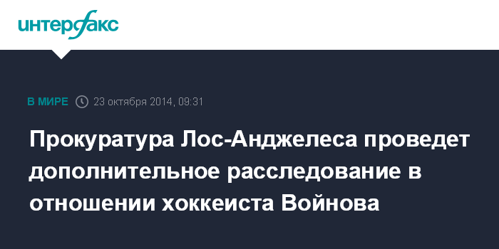Москва. 23 октября. INTERFAX.RU - Прокуратура Лос-Анджелеса попросила дополнительного расследования по делу российского защитника хоккейного клуба "Лос-Анджелес Кингз" Вячеслава Войнова, прежде чем выдвинуть спортсмену обвинение в домашнем насилии, сообщает Los-Angeles Times.